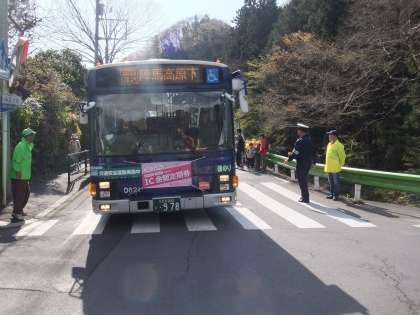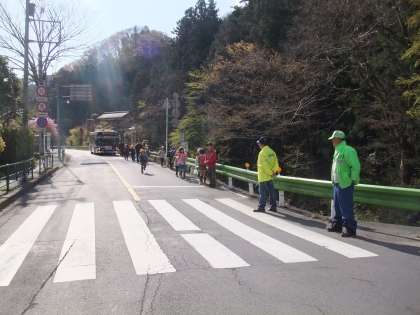 今朝のバス班の登校の様子です。安全ボランティアの方たちに見守られて登校しています。