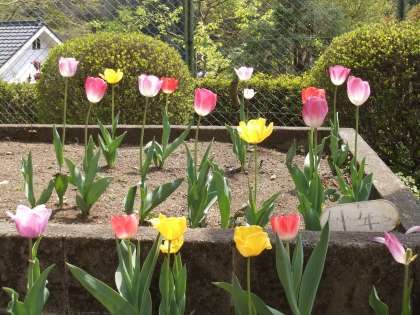 4月16日 敷地内の植物その1 暖かくなりました。敷地内にたくさんの植物が自然に出てきます。また、先日植えた野菜の苗も元気そうです。姫リンゴの花も咲いています。