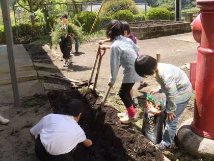 今日の授業の様子です。今日は、ALTの日でした。外国語の学習の様子は後ほど紹介いします。1年生は先生が絵本の読み聞かせの場面、2年生は漢字の学習、4年生は理科、5年生は学級活動、3年生は畑の整備をしていました。