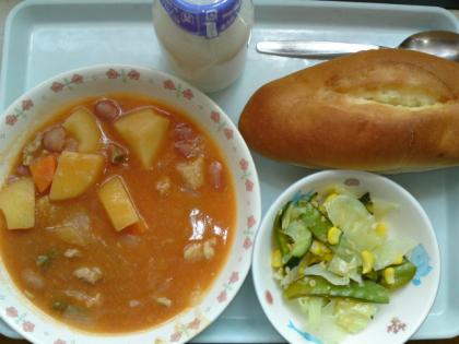 今日の給食は、ソフトフランスパン、ポークシチュー、グリーンサラダ、牛乳です。