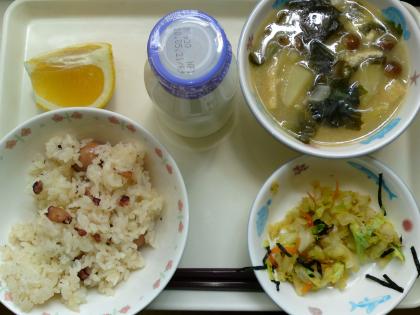 今日の給食は、タコ飯、ナメコ汁、和風サラダ、果物、牛乳です。