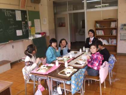 5月2日の給食時の様子です。この日は東京家政大学の学生さんがボランティアにきてくれた日です。