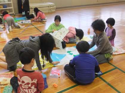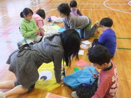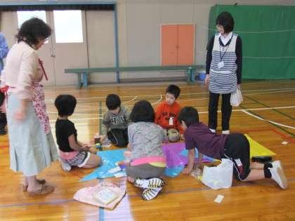 5月2日のこいのぼり集会の時の様子です。縦割り班、8班に分かれて1〜6年生が一緒になって、運動会に飾るこいのぼりを体育館でつくりました。作った後は、縦割り班の班長さんが、自分たちのこいのぼりの特徴や工夫したところや頑張ったところを発表し、こいのぼりの歌を歌って終わりました。