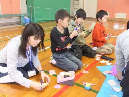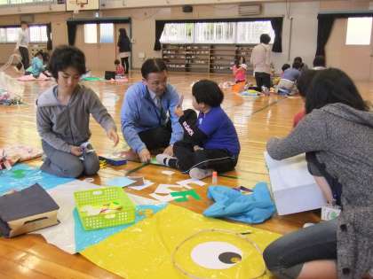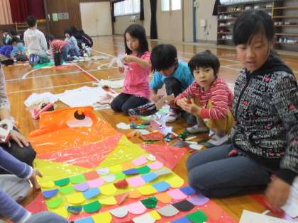 5月2日のこいのぼり集会の時の様子です。縦割り班、8班に分かれて1〜6年生が一緒になって、運動会に飾るこいのぼりを体育館でつくりました。作った後は、縦割り班の班長さんが、自分たちのこいのぼりの特徴や工夫したところや頑張ったところを発表し、こいのぼりの歌を歌って終わりました。