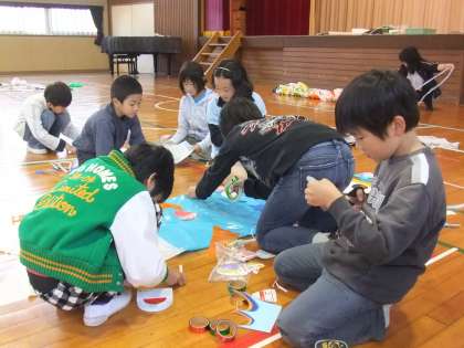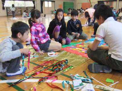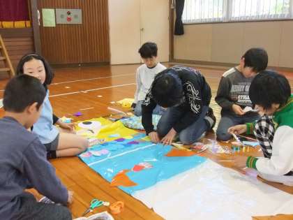 5月2日のこいのぼり集会の時の様子です。縦割り班、8班に分かれて1〜6年生が一緒になって、運動会に飾るこいのぼりを体育館でつくりました。作った後は、縦割り班の班長さんが、自分たちのこいのぼりの特徴や工夫したところや頑張ったところを発表し、こいのぼりの歌を歌って終わりました。