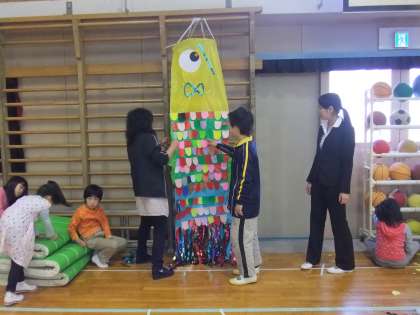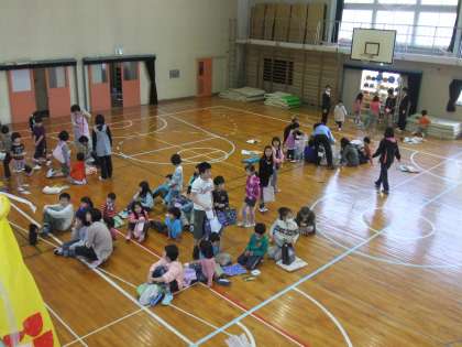 5月2日のこいのぼり集会の時の様子です。縦割り班、8班に分かれて1〜6年生が一緒になって、運動会に飾るこいのぼりを体育館でつくりました。作った後は、縦割り班の班長さんが、自分たちのこいのぼりの特徴や工夫したところや頑張ったところを発表し、こいのぼりの歌を歌って終わりました。
