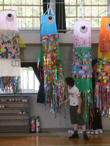 5月2日のこいのぼり集会の時の様子です。縦割り班、8班に分かれて1〜6年生が一緒になって、運動会に飾るこいのぼりを体育館でつくりました。作った後は、縦割り班の班長さんが、自分たちのこいのぼりの特徴や工夫したところや頑張ったところを発表し、こいのぼりの歌を歌って終わりました。