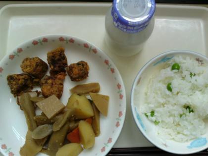 今日の給食は、グリーンピースご飯、カツオのタツタアゲ、イリドリ、牛乳です。