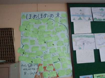 昨日の三年生の授業の様子と掲示物です。ほめほめの木という、子どもたち同士のよいところを見つけあう取り組みがされていました。