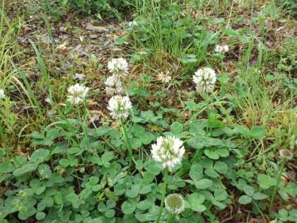 今朝、プールの周辺にたくさんのシロツメクサがお花を咲かせていました。