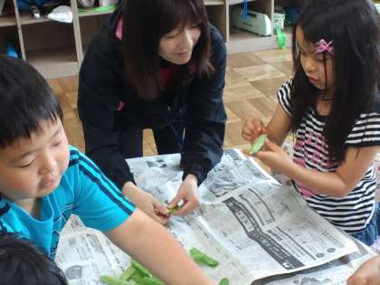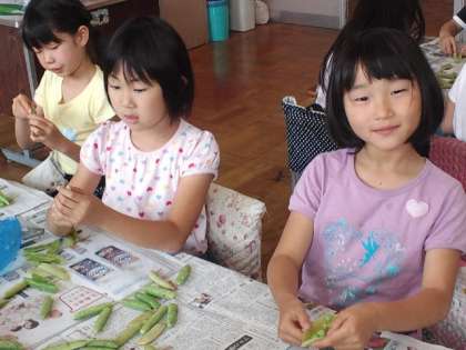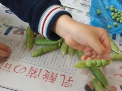 先週、2年生が給食管理委員の方から、いろいろなお豆の種類についてお話を聞かせてくれました。そのあと、金曜日の給食でグリーンピースごはんが出るので、そのさやを一生懸命むいていました。2年生のおかげでおいしいグリーンピースご飯を食べることができました。