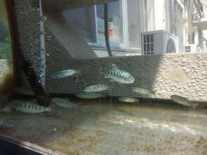 玄関前の水槽の山女魚はずいぶん大きくなりました。