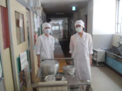 栄養教諭実習のお二人は今日は、給食室での実習でした。給食を調理員さんと一緒に作る中で沢山のことを学んできたようです。