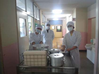 栄養教諭実習のお二人は今日は、給食室での実習でした。給食を調理員さんと一緒に作る中で沢山のことを学んできたようです。