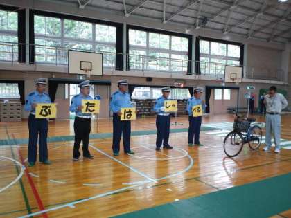 先週の金曜日に本校で1・3・5年生を対象に交通安全教室を行いました。あいにくの雨だったため、体育館で行いました。八王子市の交通事業課の方、高尾警察の方々、駐在所の方々、安全協会の方々がたくさんいらしてくださいました。3年生は無事全員満点で自転車の免許が取れました。
