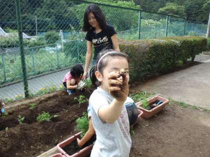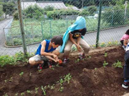 4年生は総合的な学習の時間で野菜を育てています。その中で、人参(ベビーキャロット)をプランターに種から植えました。苗が育ってきたので、畑に植え替えました。