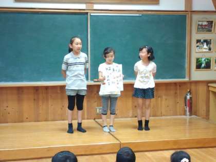来週の火曜日にロングの集会活動があります。今年度は1学期に「恩二小モール」を行います。各クラスごと楽しいお店屋さんを出してくれます。その紹介集会の時の様子です。紹介集会あと、図書委員会の委員長さんから、夏休みの図書の貸し出しについてお話がありました。