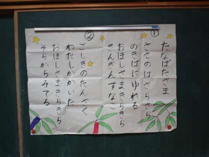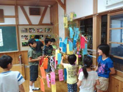先週の木曜日、七夕集会がありました。みんなの願い事が書かれた短冊を笹に飾っています。今、玄関に笹を飾っています。