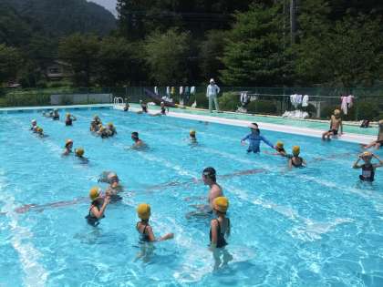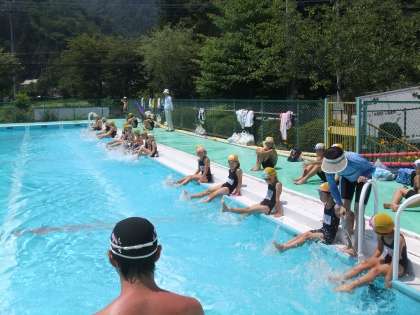 今日は、着衣泳を予定通り行いました。今年度はスポーツジムのメガロス八王子より3名の水泳のインストラクターの方に来ていたただき、指導していただきました。インストラクターの方の中に、あの北島康介選手と一緒に練習をし、実際に北島選手に次ぐタイムを持っている山下コーチにも来ていただきました。着衣泳が終ったあと、山下コーチに平泳ぎで100m泳いでいただき、そのあと、北館コーチに個人メドレーを泳いでいただきました。全体を指導していただいたのは秋葉コーチです。手本の泳ぎを見たあとは、子供たちが泳ぎ、その泳ぎを指導していただきました。水泳の後は、5年生の教室で給食も食べていただき、子供たちと交流を深めました。
