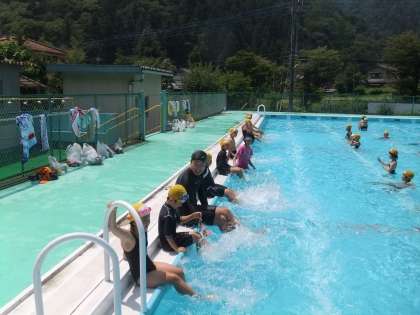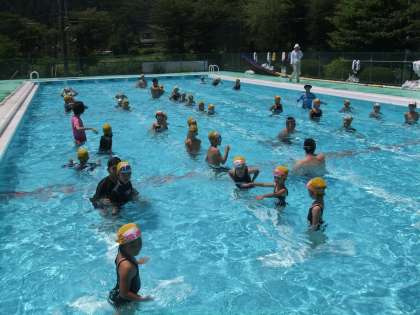 今日は、着衣泳を予定通り行いました。今年度はスポーツジムのメガロス八王子より3名の水泳のインストラクターの方に来ていたただき、指導していただきました。インストラクターの方の中に、あの北島康介選手と一緒に練習をし、実際に北島選手に次ぐタイムを持っている山下コーチにも来ていただきました。着衣泳が終ったあと、山下コーチに平泳ぎで100m泳いでいただき、そのあと、北館コーチに個人メドレーを泳いでいただきました。全体を指導していただいたのは秋葉コーチです。手本の泳ぎを見たあとは、子供たちが泳ぎ、その泳ぎを指導していただきました。水泳の後は、5年生の教室で給食も食べていただき、子供たちと交流を深めました。