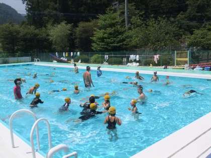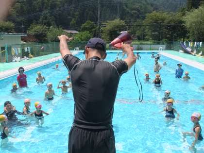 今日は、着衣泳を予定通り行いました。今年度はスポーツジムのメガロス八王子より3名の水泳のインストラクターの方に来ていたただき、指導していただきました。インストラクターの方の中に、あの北島康介選手と一緒に練習をし、実際に北島選手に次ぐタイムを持っている山下コーチにも来ていただきました。着衣泳が終ったあと、山下コーチに平泳ぎで100m泳いでいただき、そのあと、北館コーチに個人メドレーを泳いでいただきました。全体を指導していただいたのは秋葉コーチです。手本の泳ぎを見たあとは、子供たちが泳ぎ、その泳ぎを指導していただきました。水泳の後は、5年生の教室で給食も食べていただき、子供たちと交流を深めました。
