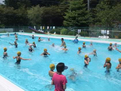 今日は、着衣泳を予定通り行いました。今年度はスポーツジムのメガロス八王子より3名の水泳のインストラクターの方に来ていたただき、指導していただきました。インストラクターの方の中に、あの北島康介選手と一緒に練習をし、実際に北島選手に次ぐタイムを持っている山下コーチにも来ていただきました。着衣泳が終ったあと、山下コーチに平泳ぎで100m泳いでいただき、そのあと、北館コーチに個人メドレーを泳いでいただきました。全体を指導していただいたのは秋葉コーチです。手本の泳ぎを見たあとは、子供たちが泳ぎ、その泳ぎを指導していただきました。水泳の後は、5年生の教室で給食も食べていただき、子供たちと交流を深めました。