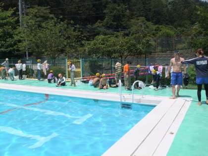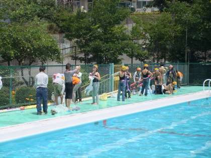 今日は、着衣泳を予定通り行いました。今年度はスポーツジムのメガロス八王子より3名の水泳のインストラクターの方に来ていたただき、指導していただきました。インストラクターの方の中に、あの北島康介選手と一緒に練習をし、実際に北島選手に次ぐタイムを持っている山下コーチにも来ていただきました。着衣泳が終ったあと、山下コーチに平泳ぎで100m泳いでいただき、そのあと、北館コーチに個人メドレーを泳いでいただきました。全体を指導していただいたのは秋葉コーチです。手本の泳ぎを見たあとは、子供たちが泳ぎ、その泳ぎを指導していただきました。水泳の後は、5年生の教室で給食も食べていただき、子供たちと交流を深めました。