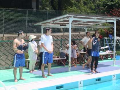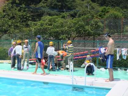今日は、着衣泳を予定通り行いました。今年度はスポーツジムのメガロス八王子より3名の水泳のインストラクターの方に来ていたただき、指導していただきました。インストラクターの方の中に、あの北島康介選手と一緒に練習をし、実際に北島選手に次ぐタイムを持っている山下コーチにも来ていただきました。着衣泳が終ったあと、山下コーチに平泳ぎで100m泳いでいただき、そのあと、北館コーチに個人メドレーを泳いでいただきました。全体を指導していただいたのは秋葉コーチです。手本の泳ぎを見たあとは、子供たちが泳ぎ、その泳ぎを指導していただきました。水泳の後は、5年生の教室で給食も食べていただき、子供たちと交流を深めました。