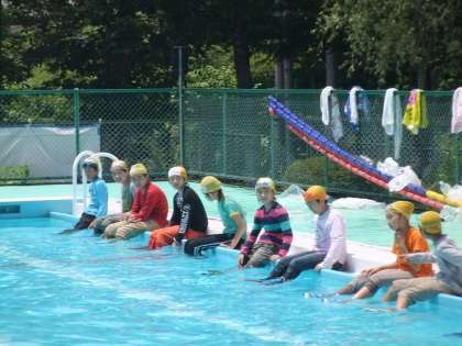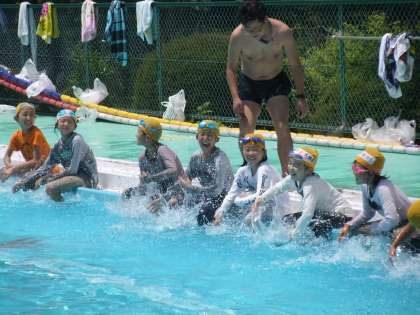 今日は、着衣泳を予定通り行いました。今年度はスポーツジムのメガロス八王子より3名の水泳のインストラクターの方に来ていたただき、指導していただきました。インストラクターの方の中に、あの北島康介選手と一緒に練習をし、実際に北島選手に次ぐタイムを持っている山下コーチにも来ていただきました。着衣泳が終ったあと、山下コーチに平泳ぎで100m泳いでいただき、そのあと、北館コーチに個人メドレーを泳いでいただきました。全体を指導していただいたのは秋葉コーチです。手本の泳ぎを見たあとは、子供たちが泳ぎ、その泳ぎを指導していただきました。水泳の後は、5年生の教室で給食も食べていただき、子供たちと交流を深めました。