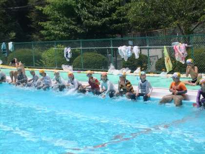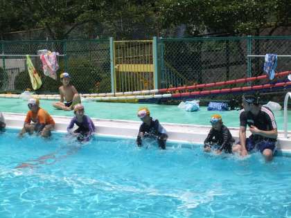 今日は、着衣泳を予定通り行いました。今年度はスポーツジムのメガロス八王子より3名の水泳のインストラクターの方に来ていたただき、指導していただきました。インストラクターの方の中に、あの北島康介選手と一緒に練習をし、実際に北島選手に次ぐタイムを持っている山下コーチにも来ていただきました。着衣泳が終ったあと、山下コーチに平泳ぎで100m泳いでいただき、そのあと、北館コーチに個人メドレーを泳いでいただきました。全体を指導していただいたのは秋葉コーチです。手本の泳ぎを見たあとは、子供たちが泳ぎ、その泳ぎを指導していただきました。水泳の後は、5年生の教室で給食も食べていただき、子供たちと交流を深めました。