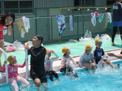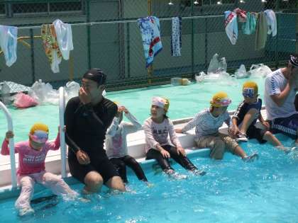 今日は、着衣泳を予定通り行いました。今年度はスポーツジムのメガロス八王子より3名の水泳のインストラクターの方に来ていたただき、指導していただきました。インストラクターの方の中に、あの北島康介選手と一緒に練習をし、実際に北島選手に次ぐタイムを持っている山下コーチにも来ていただきました。着衣泳が終ったあと、山下コーチに平泳ぎで100m泳いでいただき、そのあと、北館コーチに個人メドレーを泳いでいただきました。全体を指導していただいたのは秋葉コーチです。手本の泳ぎを見たあとは、子供たちが泳ぎ、その泳ぎを指導していただきました。水泳の後は、5年生の教室で給食も食べていただき、子供たちと交流を深めました。