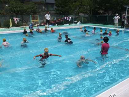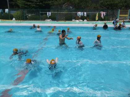 今日は、着衣泳を予定通り行いました。今年度はスポーツジムのメガロス八王子より3名の水泳のインストラクターの方に来ていたただき、指導していただきました。インストラクターの方の中に、あの北島康介選手と一緒に練習をし、実際に北島選手に次ぐタイムを持っている山下コーチにも来ていただきました。着衣泳が終ったあと、山下コーチに平泳ぎで100m泳いでいただき、そのあと、北館コーチに個人メドレーを泳いでいただきました。全体を指導していただいたのは秋葉コーチです。手本の泳ぎを見たあとは、子供たちが泳ぎ、その泳ぎを指導していただきました。水泳の後は、5年生の教室で給食も食べていただき、子供たちと交流を深めました。
