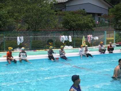 今日は、着衣泳を予定通り行いました。今年度はスポーツジムのメガロス八王子より3名の水泳のインストラクターの方に来ていたただき、指導していただきました。インストラクターの方の中に、あの北島康介選手と一緒に練習をし、実際に北島選手に次ぐタイムを持っている山下コーチにも来ていただきました。着衣泳が終ったあと、山下コーチに平泳ぎで100m泳いでいただき、そのあと、北館コーチに個人メドレーを泳いでいただきました。全体を指導していただいたのは秋葉コーチです。手本の泳ぎを見たあとは、子供たちが泳ぎ、その泳ぎを指導していただきました。水泳の後は、5年生の教室で給食も食べていただき、子供たちと交流を深めました。