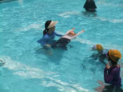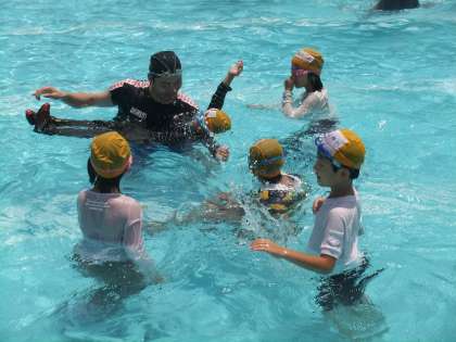 今日は、着衣泳を予定通り行いました。今年度はスポーツジムのメガロス八王子より3名の水泳のインストラクターの方に来ていたただき、指導していただきました。インストラクターの方の中に、あの北島康介選手と一緒に練習をし、実際に北島選手に次ぐタイムを持っている山下コーチにも来ていただきました。着衣泳が終ったあと、山下コーチに平泳ぎで100m泳いでいただき、そのあと、北館コーチに個人メドレーを泳いでいただきました。全体を指導していただいたのは秋葉コーチです。手本の泳ぎを見たあとは、子供たちが泳ぎ、その泳ぎを指導していただきました。水泳の後は、5年生の教室で給食も食べていただき、子供たちと交流を深めました。