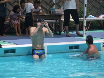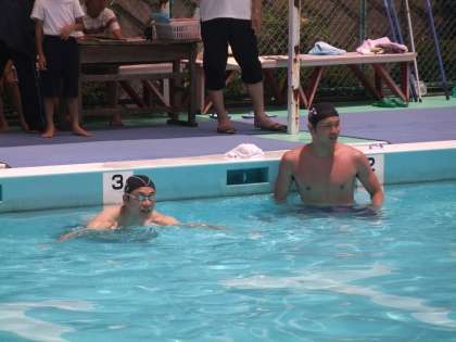 今日は、着衣泳を予定通り行いました。今年度はスポーツジムのメガロス八王子より3名の水泳のインストラクターの方に来ていたただき、指導していただきました。インストラクターの方の中に、あの北島康介選手と一緒に練習をし、実際に北島選手に次ぐタイムを持っている山下コーチにも来ていただきました。着衣泳が終ったあと、山下コーチに平泳ぎで100m泳いでいただき、そのあと、北館コーチに個人メドレーを泳いでいただきました。全体を指導していただいたのは秋葉コーチです。手本の泳ぎを見たあとは、子供たちが泳ぎ、その泳ぎを指導していただきました。水泳の後は、5年生の教室で給食も食べていただき、子供たちと交流を深めました。