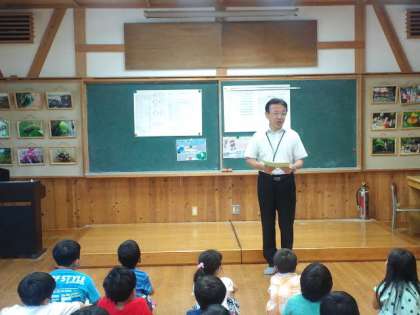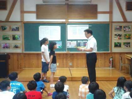 全校朝会では、昨年度の3年生の交通安全ポスターの表彰、養護の先生から健康カードの記入の仕方の話がありました。また、全校で、「ストップ!いじめ」のDVDを見て、いじめについて考えました。