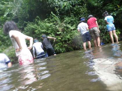 昨日、3・4年生が総合的な学習の時間で学校の前の醍醐川で「川の学習」をしてきました。色々な川の生き物をみつけていました。