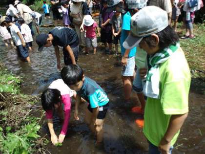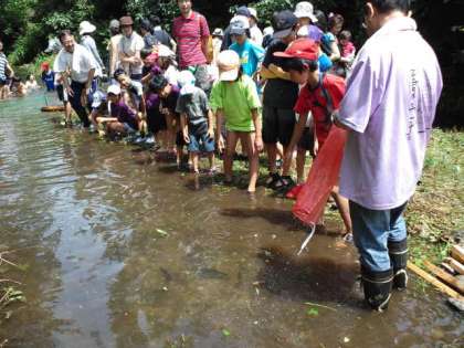 7月21日日曜日本校のPTA夏行事を行いました。今年度は一昨年度行った「ヤマメのつかみ取り」を行いました。たくさんの子供達、保護者の方、そして恩一小のPTA役員の方も見にきてくれました。学校の前の醍醐川にニジマスを放流し、子供たちがそのニジマスをつかみ取り、塩焼きにして食べました。ヤマメの塩焼きの串は、本校のゲストティーチャーの竹細工・わら細工を指導してくださっている岡本さんが作ってくださいました。