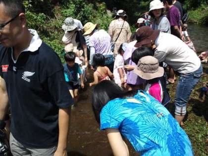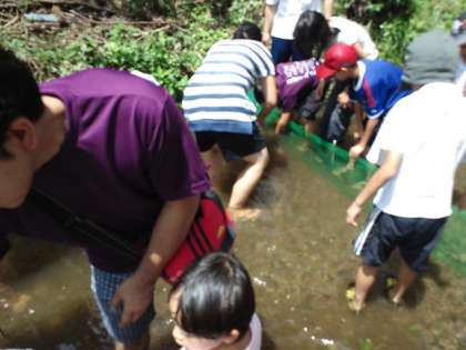 7月21日日曜日本校のPTA夏行事を行いました。今年度は一昨年度行った「ヤマメのつかみ取り」を行いました。たくさんの子供達、保護者の方、そして恩一小のPTA役員の方も見にきてくれました。学校の前の醍醐川にニジマスを放流し、子供たちがそのニジマスをつかみ取り、塩焼きにして食べました。ヤマメの塩焼きの串は、本校のゲストティーチャーの竹細工・わら細工を指導してくださっている岡本さんが作ってくださいました。