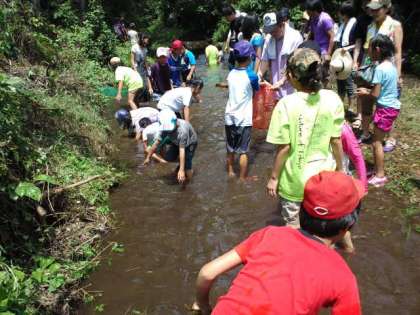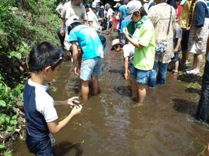 7月21日日曜日本校のPTA夏行事を行いました。今年度は一昨年度行った「ヤマメのつかみ取り」を行いました。たくさんの子供達、保護者の方、そして恩一小のPTA役員の方も見にきてくれました。学校の前の醍醐川にニジマスを放流し、子供たちがそのニジマスをつかみ取り、塩焼きにして食べました。ヤマメの塩焼きの串は、本校のゲストティーチャーの竹細工・わら細工を指導してくださっている岡本さんが作ってくださいました。