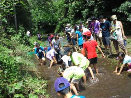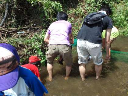 7月21日日曜日本校のPTA夏行事を行いました。今年度は一昨年度行った「ヤマメのつかみ取り」を行いました。たくさんの子供達、保護者の方、そして恩一小のPTA役員の方も見にきてくれました。学校の前の醍醐川にニジマスを放流し、子供たちがそのニジマスをつかみ取り、塩焼きにして食べました。ヤマメの塩焼きの串は、本校のゲストティーチャーの竹細工・わら細工を指導してくださっている岡本さんが作ってくださいました。