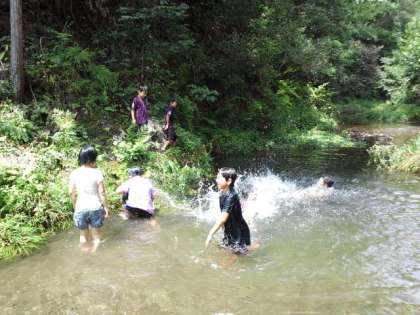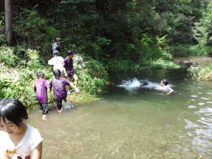 7月21日日曜日本校のPTA夏行事を行いました。今年度は一昨年度行った「ヤマメのつかみ取り」を行いました。たくさんの子供達、保護者の方、そして恩一小のPTA役員の方も見にきてくれました。学校の前の醍醐川にニジマスを放流し、子供たちがそのニジマスをつかみ取り、塩焼きにして食べました。ヤマメの塩焼きの串は、本校のゲストティーチャーの竹細工・わら細工を指導してくださっている岡本さんが作ってくださいました。