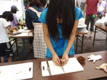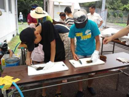 7月21日日曜日本校のPTA夏行事を行いました。今年度は一昨年度行った「ヤマメのつかみ取り」を行いました。たくさんの子供達、保護者の方、そして恩一小のPTA役員の方も見にきてくれました。学校の前の醍醐川にニジマスを放流し、子供たちがそのニジマスをつかみ取り、塩焼きにして食べました。ヤマメの塩焼きの串は、本校のゲストティーチャーの竹細工・わら細工を指導してくださっている岡本さんが作ってくださいました。