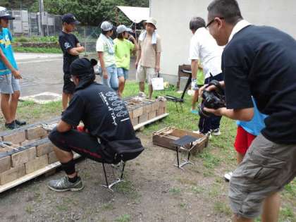 7月21日日曜日本校のPTA夏行事を行いました。今年度は一昨年度行った「ヤマメのつかみ取り」を行いました。たくさんの子供達、保護者の方、そして恩一小のPTA役員の方も見にきてくれました。学校の前の醍醐川にニジマスを放流し、子供たちがそのニジマスをつかみ取り、塩焼きにして食べました。ヤマメの塩焼きの串は、本校のゲストティーチャーの竹細工・わら細工を指導してくださっている岡本さんが作ってくださいました。