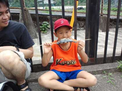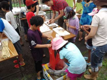 7月21日日曜日本校のPTA夏行事を行いました。今年度は一昨年度行った「ヤマメのつかみ取り」を行いました。たくさんの子供達、保護者の方、そして恩一小のPTA役員の方も見にきてくれました。学校の前の醍醐川にニジマスを放流し、子供たちがそのニジマスをつかみ取り、塩焼きにして食べました。ヤマメの塩焼きの串は、本校のゲストティーチャーの竹細工・わら細工を指導してくださっている岡本さんが作ってくださいました。