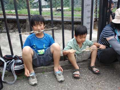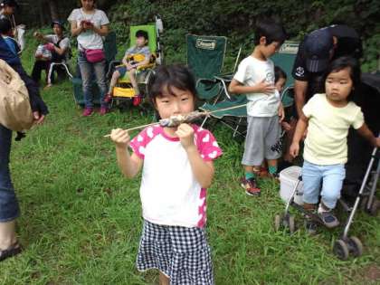 7月21日日曜日本校のPTA夏行事を行いました。今年度は一昨年度行った「ヤマメのつかみ取り」を行いました。たくさんの子供達、保護者の方、そして恩一小のPTA役員の方も見にきてくれました。学校の前の醍醐川にニジマスを放流し、子供たちがそのニジマスをつかみ取り、塩焼きにして食べました。ヤマメの塩焼きの串は、本校のゲストティーチャーの竹細工・わら細工を指導してくださっている岡本さんが作ってくださいました。