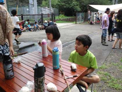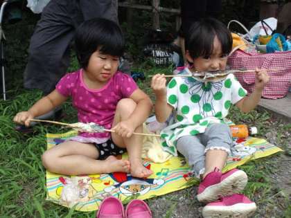 7月21日日曜日本校のPTA夏行事を行いました。今年度は一昨年度行った「ヤマメのつかみ取り」を行いました。たくさんの子供達、保護者の方、そして恩一小のPTA役員の方も見にきてくれました。学校の前の醍醐川にニジマスを放流し、子供たちがそのニジマスをつかみ取り、塩焼きにして食べました。ヤマメの塩焼きの串は、本校のゲストティーチャーの竹細工・わら細工を指導してくださっている岡本さんが作ってくださいました。