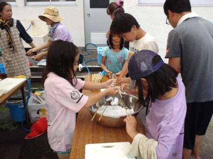 7月21日日曜日本校のPTA夏行事を行いました。今年度は一昨年度行った「ヤマメのつかみ取り」を行いました。たくさんの子供達、保護者の方、そして恩一小のPTA役員の方も見にきてくれました。学校の前の醍醐川にニジマスを放流し、子供たちがそのニジマスをつかみ取り、塩焼きにして食べました。ヤマメの塩焼きの串は、本校のゲストティーチャーの竹細工・わら細工を指導してくださっている岡本さんが作ってくださいました。