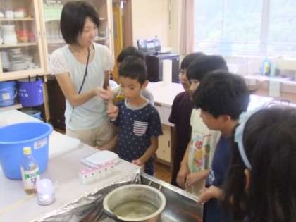 今週はそのまゆを使って、創作活動をしました。まず、繭玉を染めているところを紹介します。
