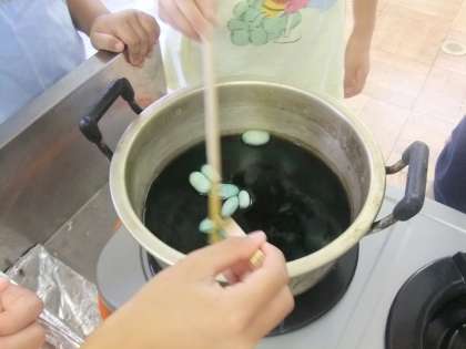今週はそのまゆを使って、創作活動をしました。まず、繭玉を染めているところを紹介します。